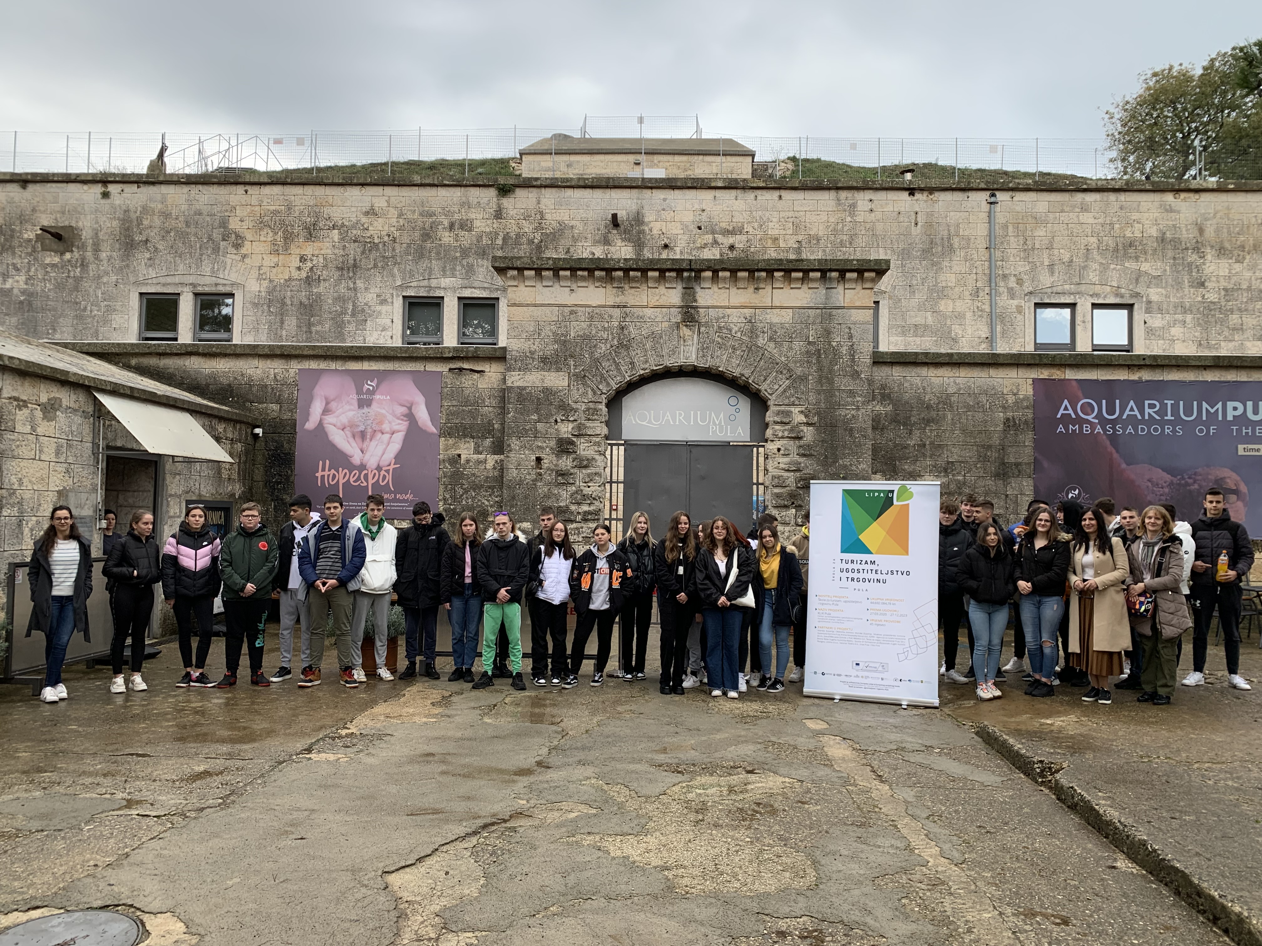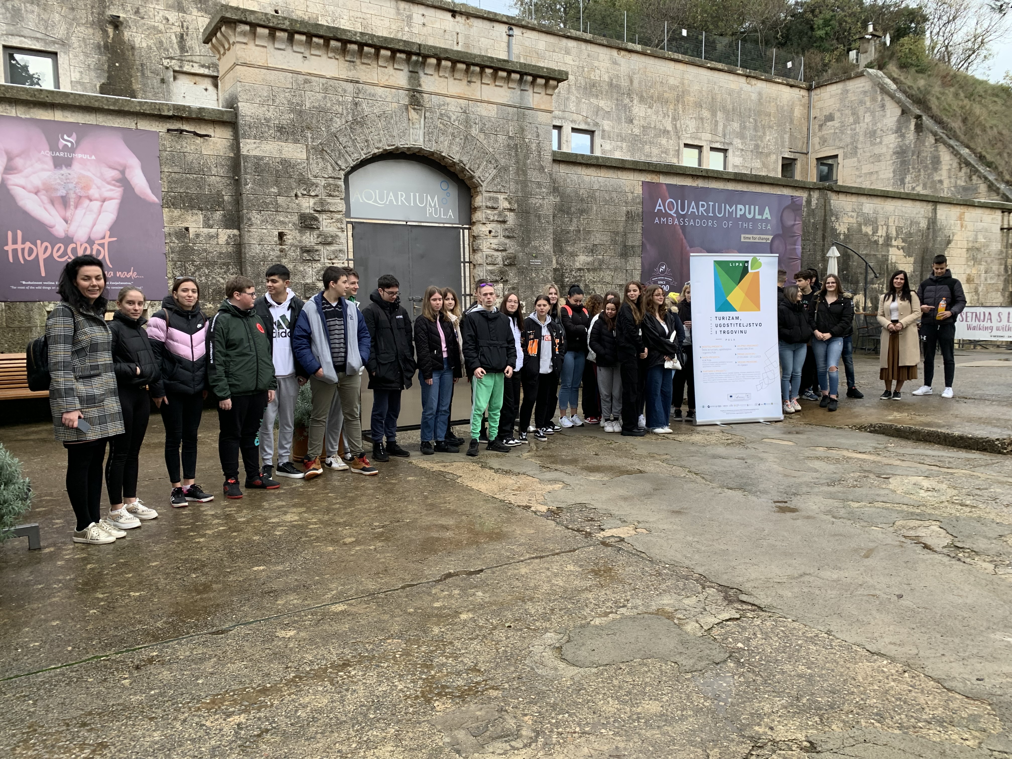U 9,30 ispred Aquariuma dočekale su nas iz HGK-a g. Ticiana Trošt Kožljan i Morena Mačina, pozdrvile učenika i upoznale nas s programom. S počecima i razvojem Aquariuma Pula od 2002. do danas, planovima, nagradama i fondom upoznala nas je uz kratku prezentaciju g. Žana Moscana. Potom nam se obratio g. Goran Franinović iz TZ-a Pula i predstavio ustroj i ulogu turističke zajednice u promidžbi turizma. Potom smo razgledali postavu Aquariuma do 11,30 kad smo krenuli u restoran Navetta u Fažani gdje smo imali organiziran izvrstan ručak od tri slijeda.