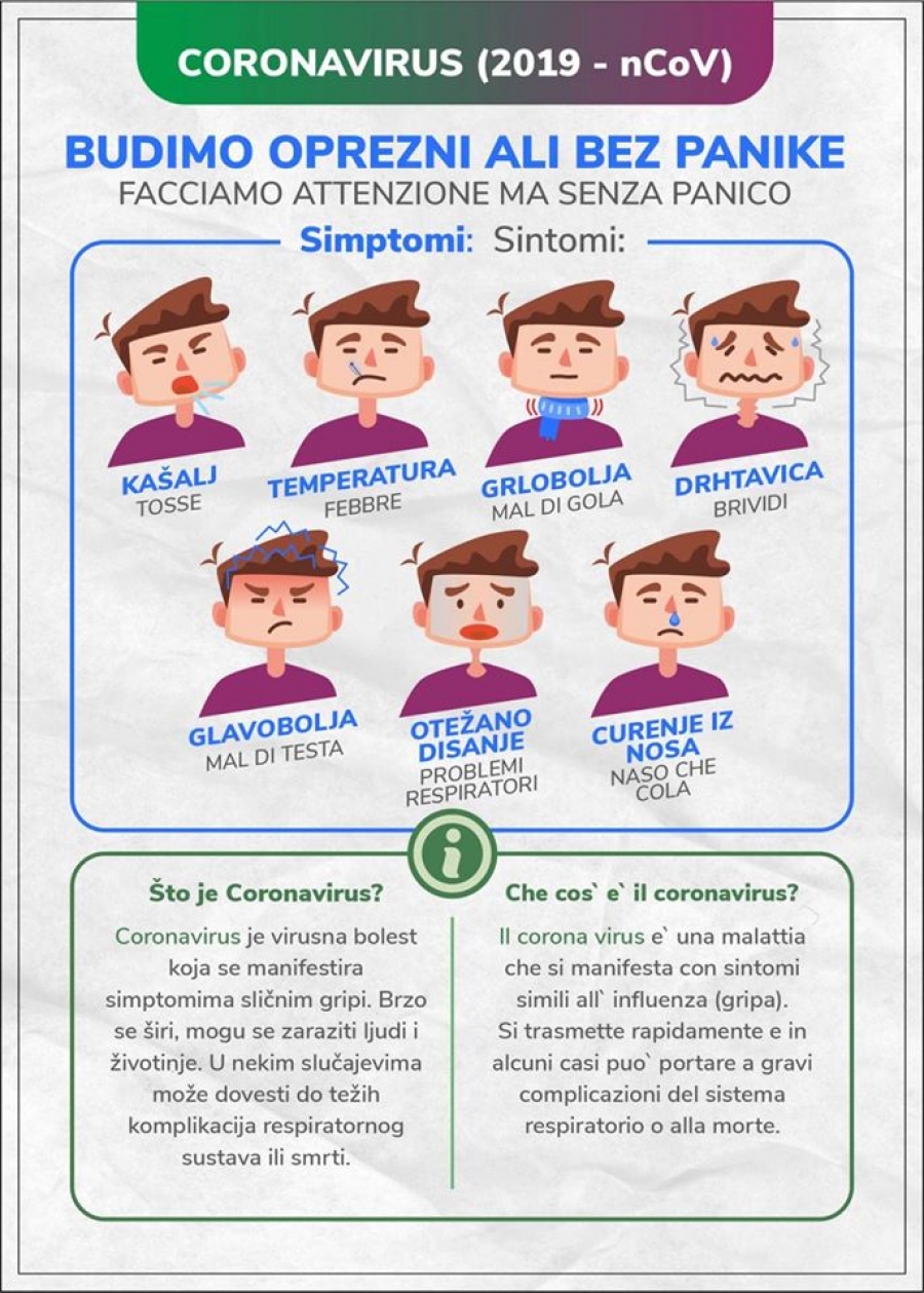 nekoliko informacija vezanih uz coronavirus. Kako se ponašati i kako postupati, koji su simptomi i koje preventivne mjere možemo koristiti. Obavezno pročitati letak.